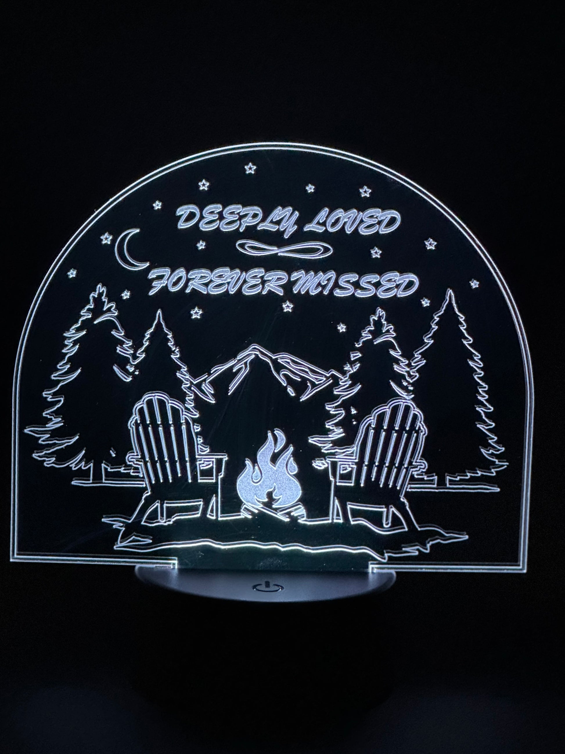 This custom display lights up with multiple color options.  It can fade from one color to the next and increase or decrease in brightness, making it a unique gift for all occasions. It comes complete with LED night light base, multi-color remote control for easy customization and USB cord.