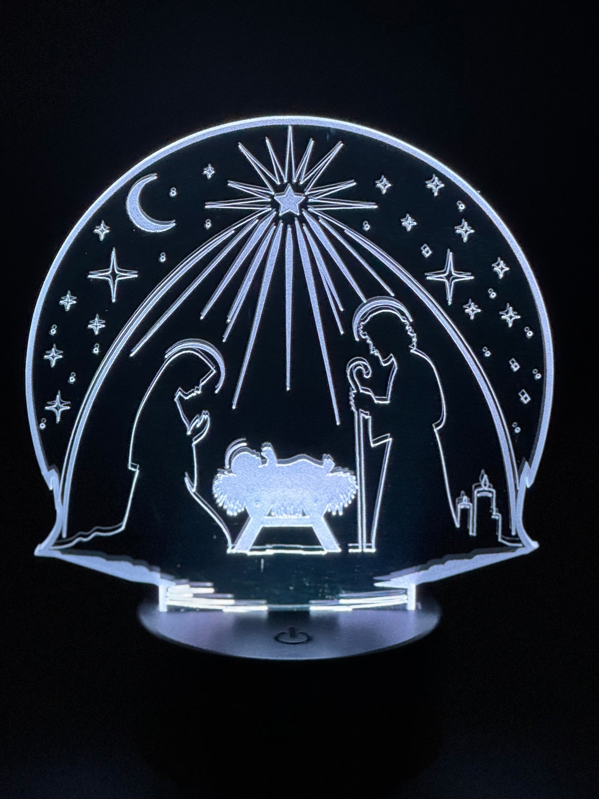 This custom display lights up with multiple color options.  It can fade from one color to the next and increase or decrease in brightness, making it a unique gift for all occasions. It comes complete with LED night light base, multi-color remote control for easy customization and USB cord.