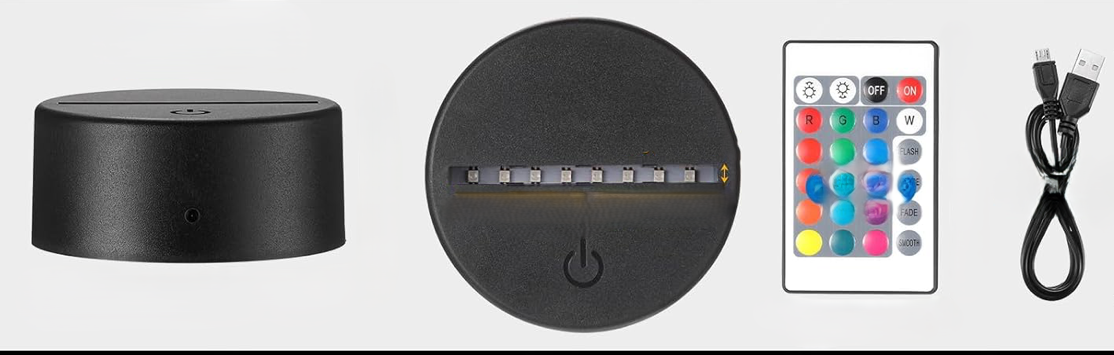 This custom display lights up with multiple color options.  It can fade from one color to the next and increase or decrease in brightness, making it a unique gift for all occasions. It comes complete with LED night light base, multi-color remote control for easy customization and USB cord.